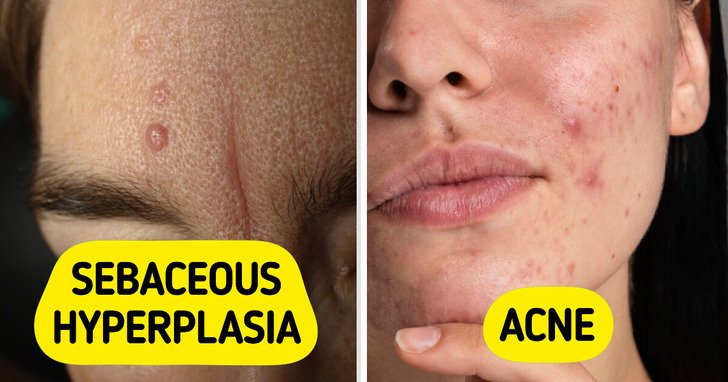 Sebaceous hyperplasia looks like acne but is actually caused by enlarged oil glands.