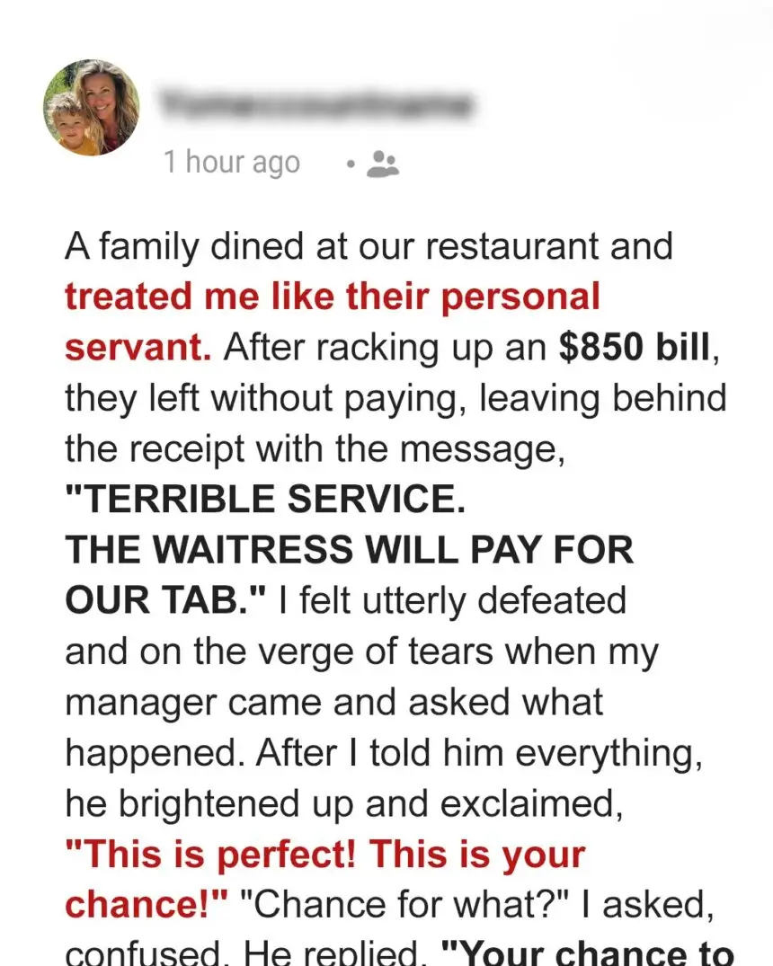 When a family skipped out on their $850 restaurant tab, I was devastated. But with my manager’s shrewd plan and an unexpected ally, we turned the tables in a way they never saw coming.