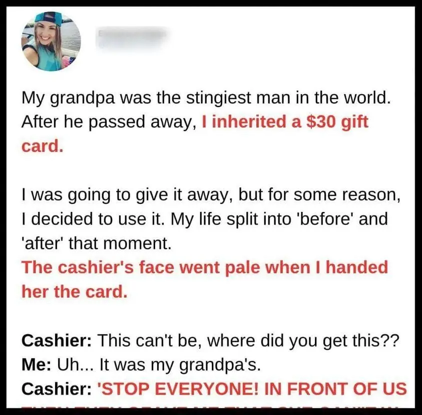My grandfather was the world’s most cheap person. I got a $30 gift card from him after he d!ed.