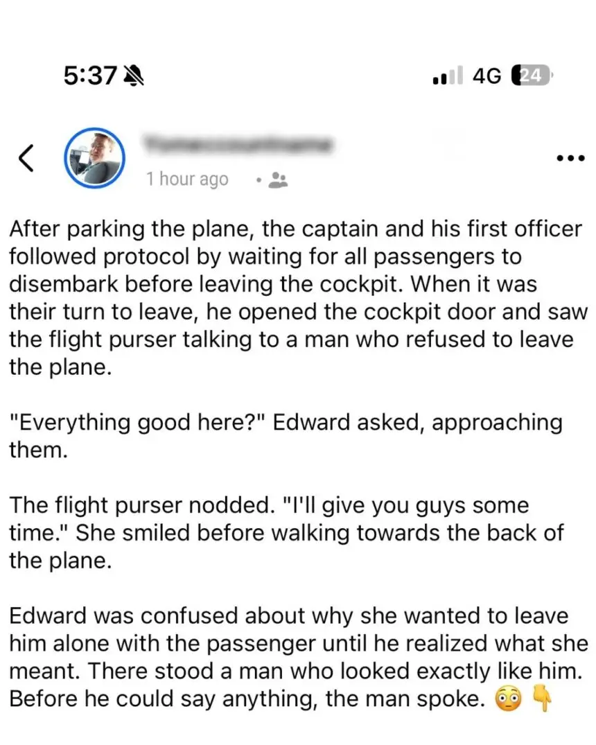 Before disembarking the plane he had just landed, Captain Edward Blair noticed a lone man on the plane who refused to leave. Upon looking clearly, he realized the man was his carbon copy.