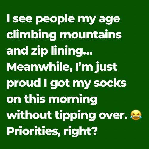 I see people my age climbing mountains and zip lining… Meanwhile, I’m just proud I got my socks on this morning without tipping over. Priorities, right?