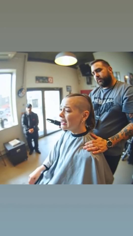 A young woman went to the barbershop to shave off her hair that was falling