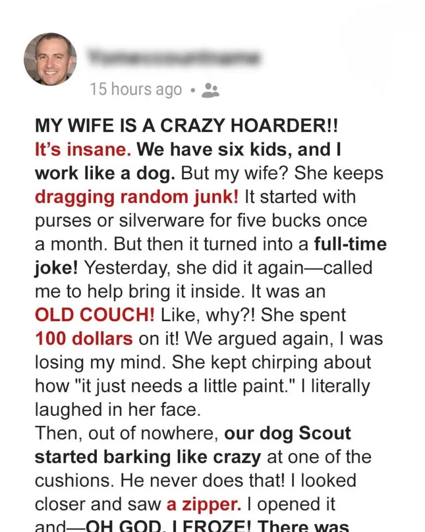 A husband mocks his wife for buying an old sofa for $100 at a flea market.