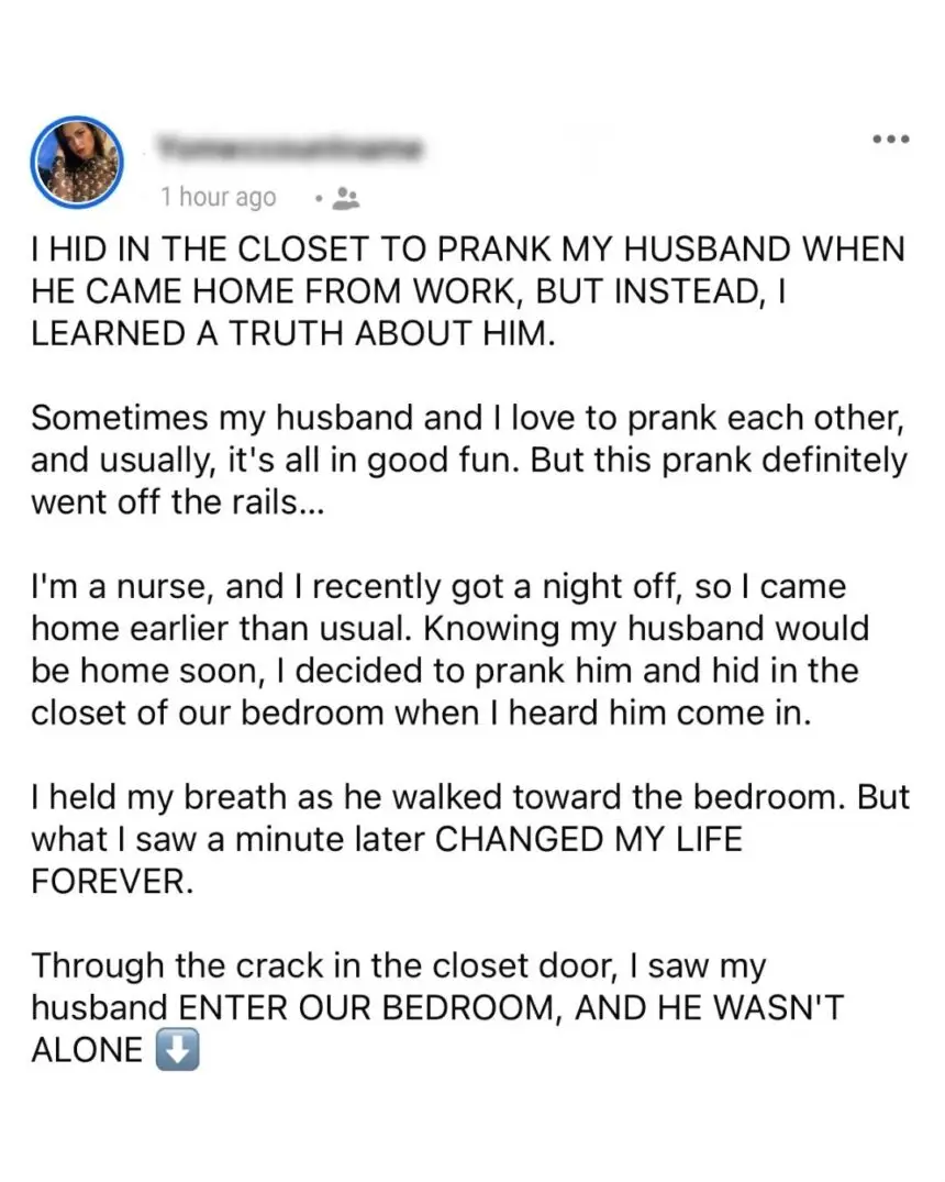 Knowing my husband would be home soon, I decided to play a prank on him. I hid in the closet of our bedroom when I heard him come in and held my breath as he walked toward our bedroom.