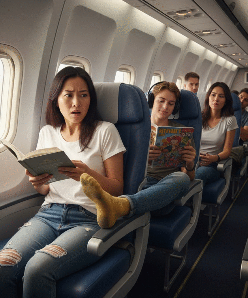A sock, once white and now bravely gray, was draped across my armrest like it had paid for the seat.