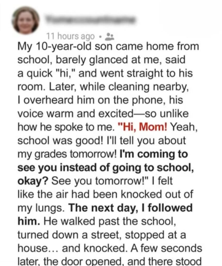 My 10-year-old son came home from school, barely glanced at me, said a quick “hi,” and went straight to his room. Later, while cleaning nearby, I overheard him on the phone, his voice warm and excited-so unlike how he spoke to me. “Hi, Mom!