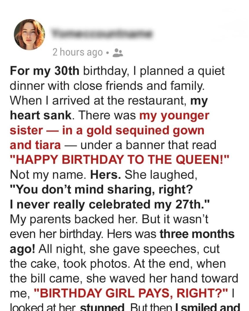 Growing up, my younger sister Kayla was always the golden child. She got away with everything, from crashing cars to skipping school, while I got grounded for the tiniest things. I thought adulthood would bring balance, but nothing changed — especially when she hijacked my 30th birthday.